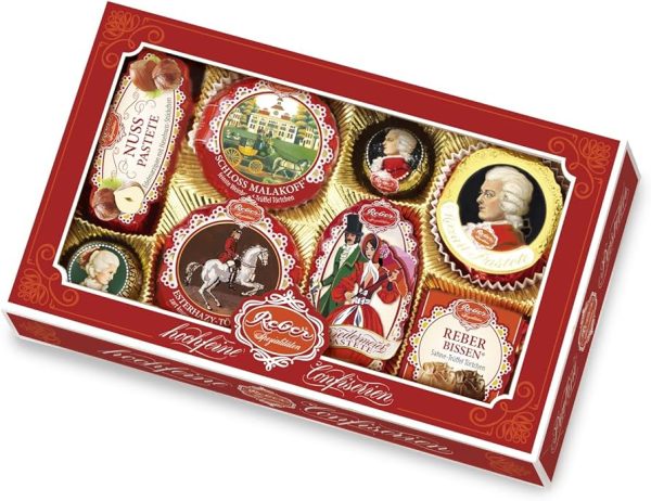 Kjo kuti premium përmban një përzgjedhje të kuruar me kujdes të 8 specialiteteve Mozart, çokollata ikonike austriake të njohura për kombinimin harmonik të shijeve klasike. Brenda kutisë gjenden forma dhe përzierje të ndryshme Mozart-Kugeln, të cilat ndërthurin marcipanin e pistakut, krem nugate, si dhe shtresa të çokollatës së cilësisë së lartë që shkrin butë në gojë.