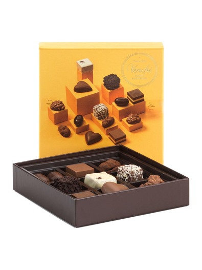 • Formati: Rreth 9 copë me shije të ndryshme – 75% ekstra të zeza, karamel i kriposur, stracciatella, portokall, pistachio, Gianduia me IGP Piemonte, krem çokollate